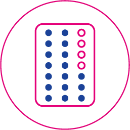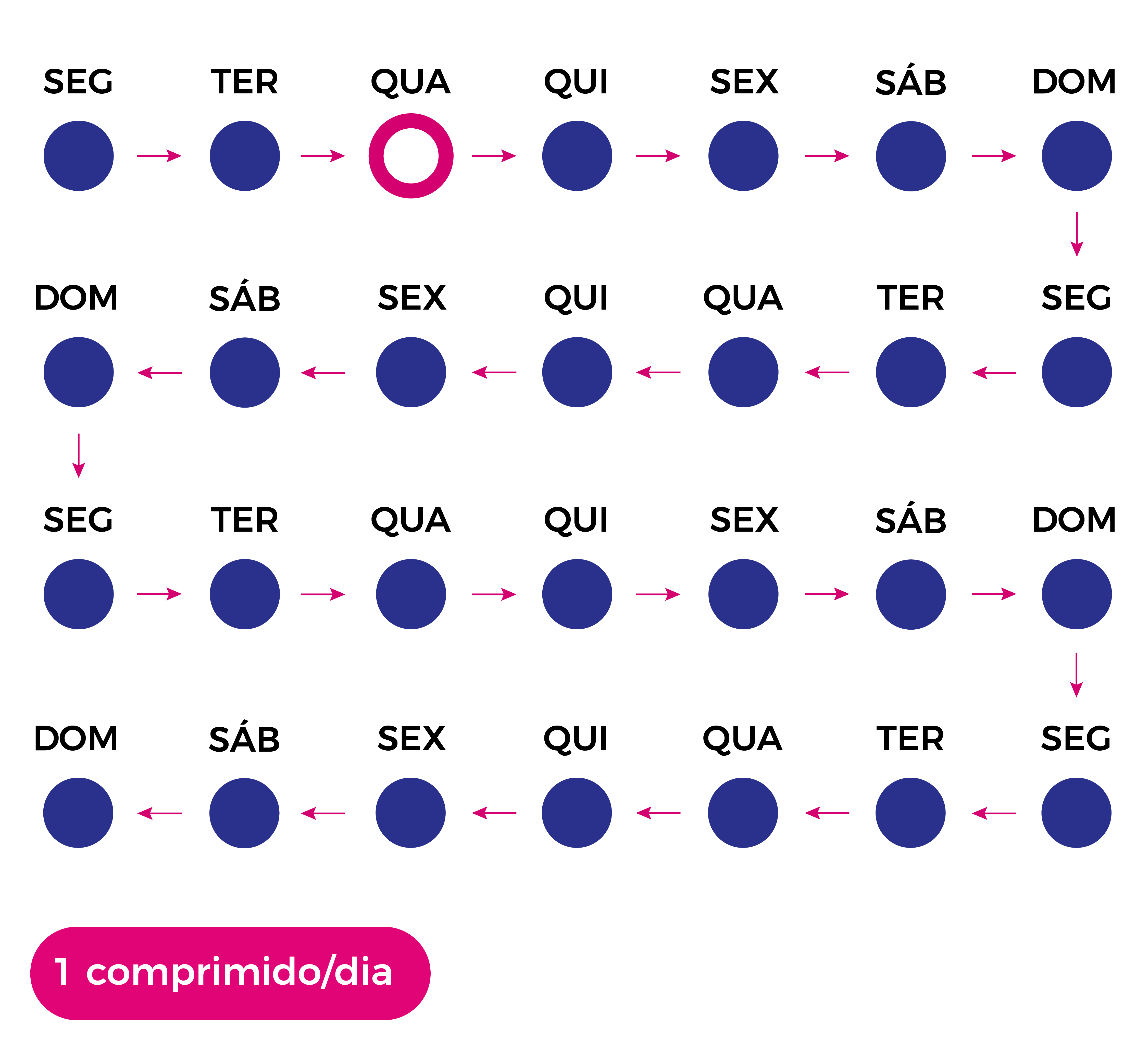 Ao começar uma nova cartela, inicie pelo comprimido da primeira linha (linha de cima) correspondente ao dia da semana em que está começando. Por exemplo, se você começar na quarta-feira, tome o comprimido marcado com “QUA” na parte de trás da cartela.
